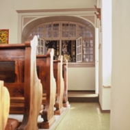 これによって、内部から外部への患者のまなざしが構成される。それを斎藤はこのプロジェクトのコンセプトとして採用している。窓から祭壇に向けられた眼差しは、建築物の通常の窓としての機能のもとでの窓ではなく、一つの内部空間から次の空間への橋として通りぬける。「外部」は患者に自然ではなく、人工的に構成された祭壇の内装の要素として自らを示す。祭壇には葉飾り、枝、花飾り、巻き込み装飾の渦巻き、天使が見出される。この空間にも何十にも封印された光が注ぐ聖域に、自然からの引用がこのように見出されるのだ。